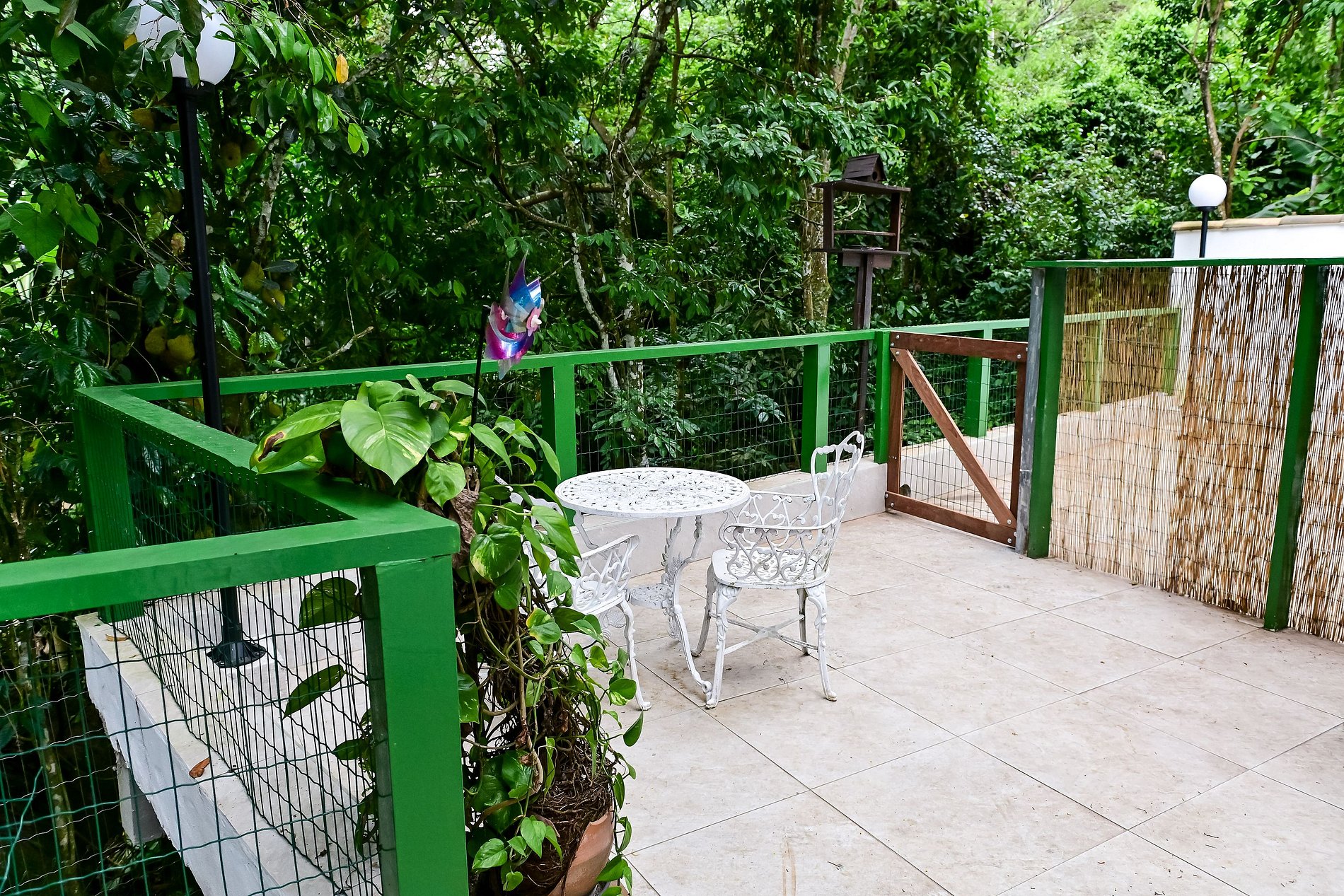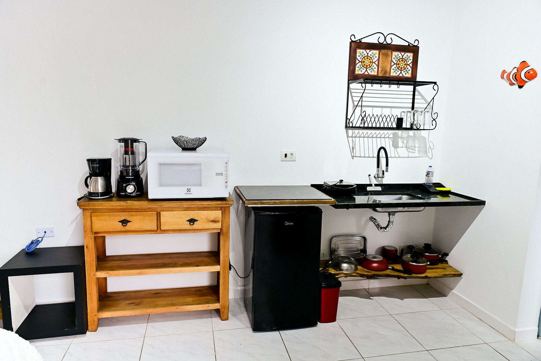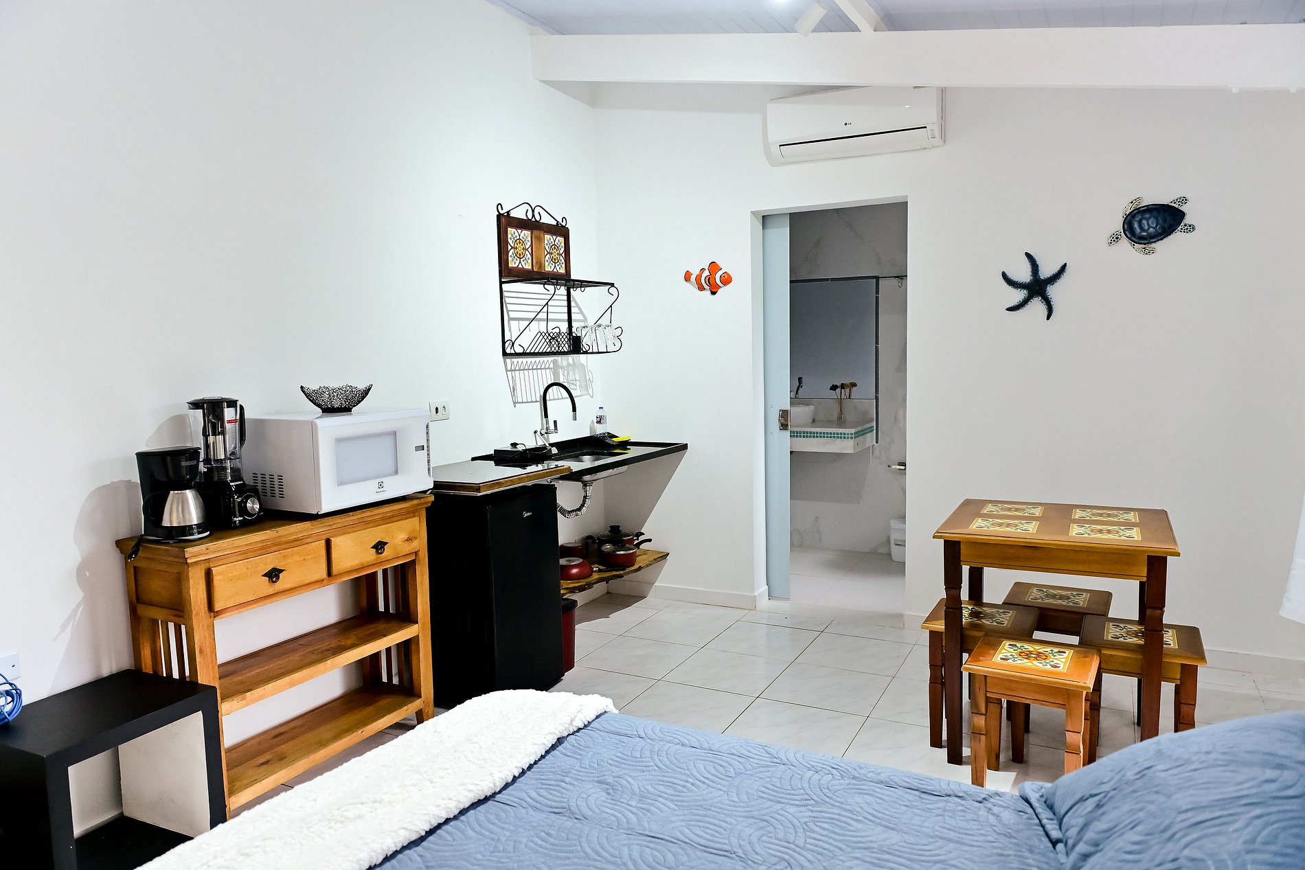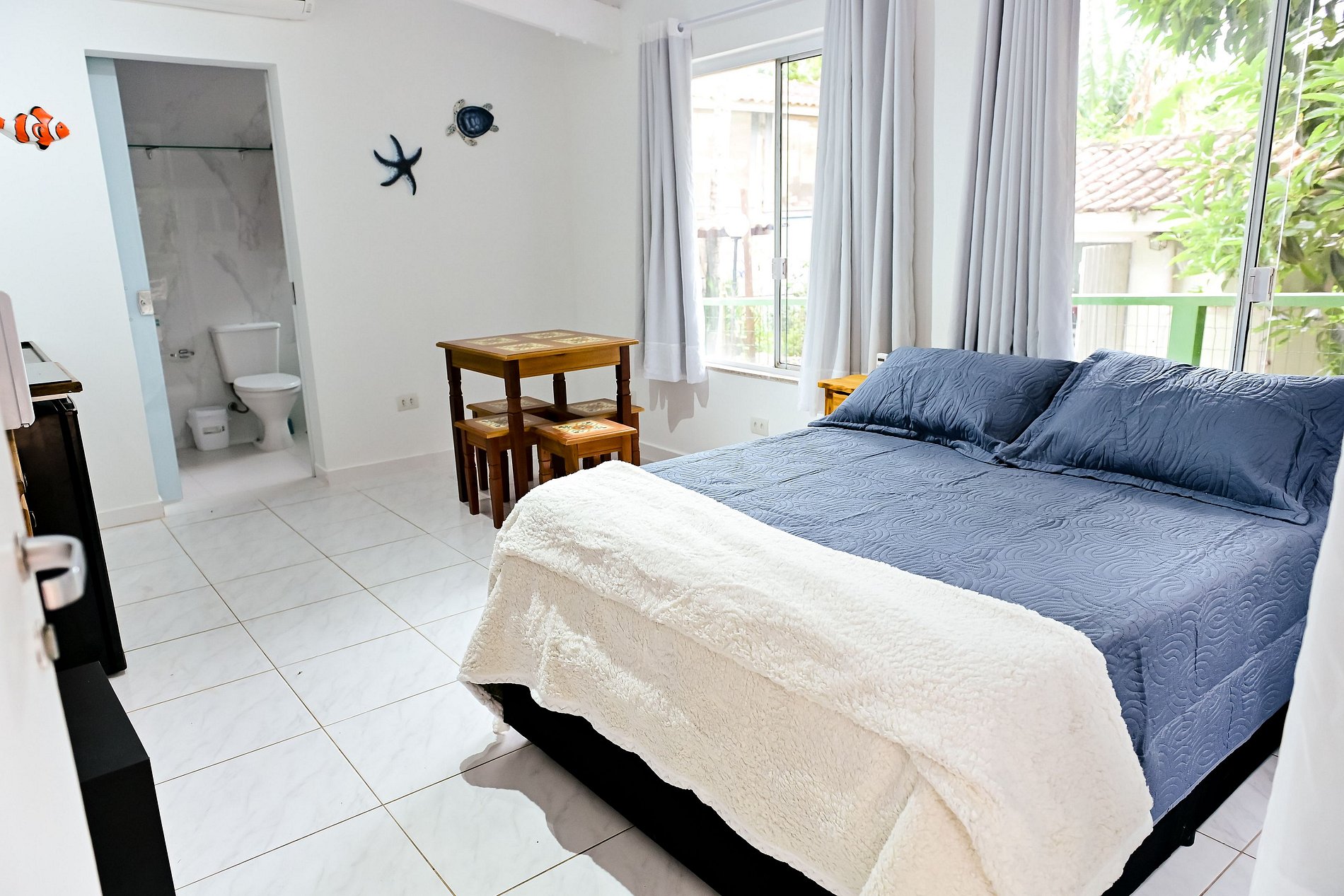 Uma suíte charmosa para duas pessoas, com ar-condicionado, TV e uma cozinha totalmente equipada para você se sentir em casa. O destaque está na varanda: imersa na mata e com vista para um riacho cristalino. Aqui, o descanso é real — você adormece com o som suave da água e acorda cercado pela natureza da Feiticeira. E o melhor: a menos de 10 min andando da Praia da Feiticeira!