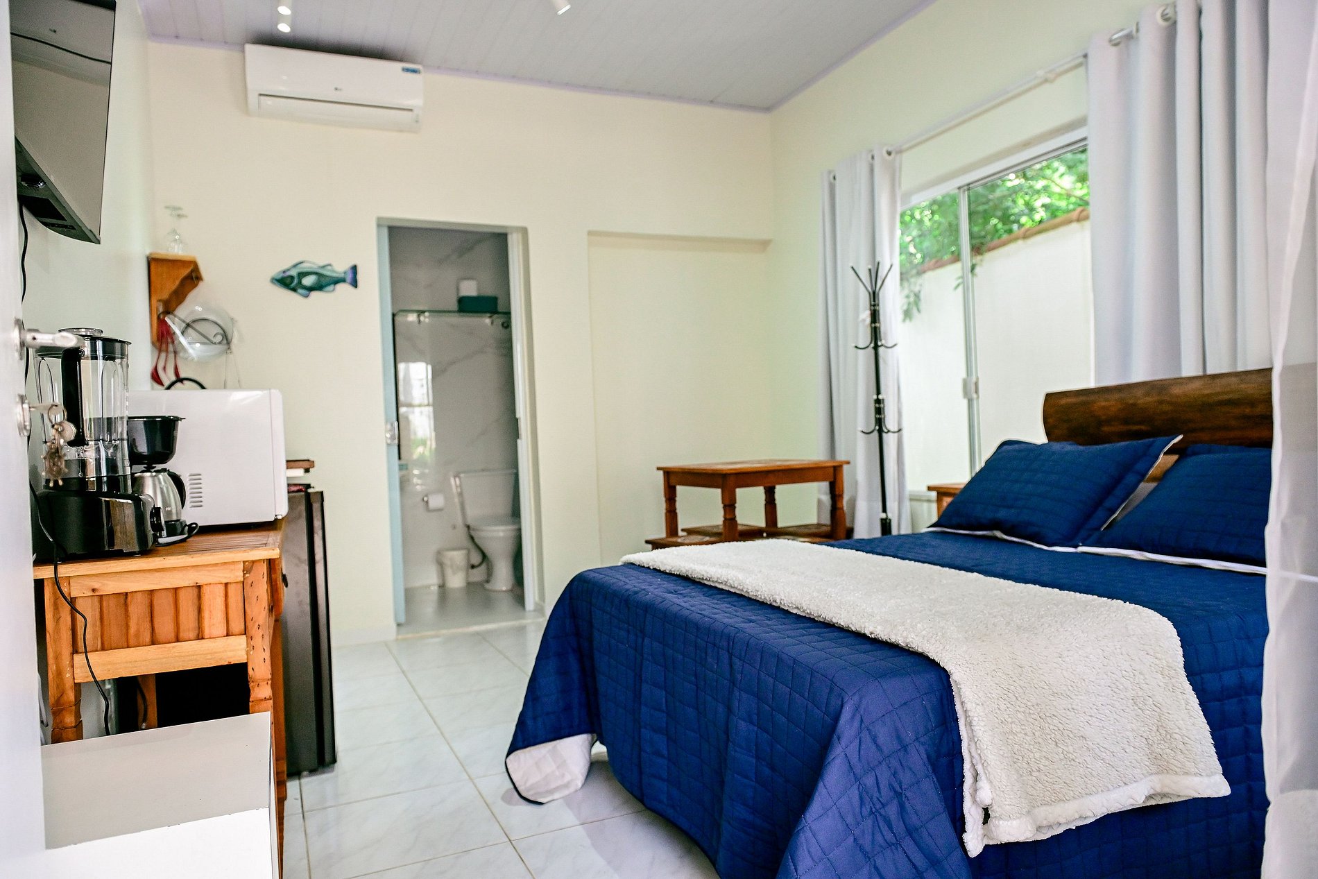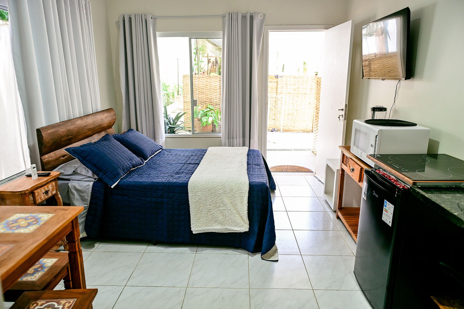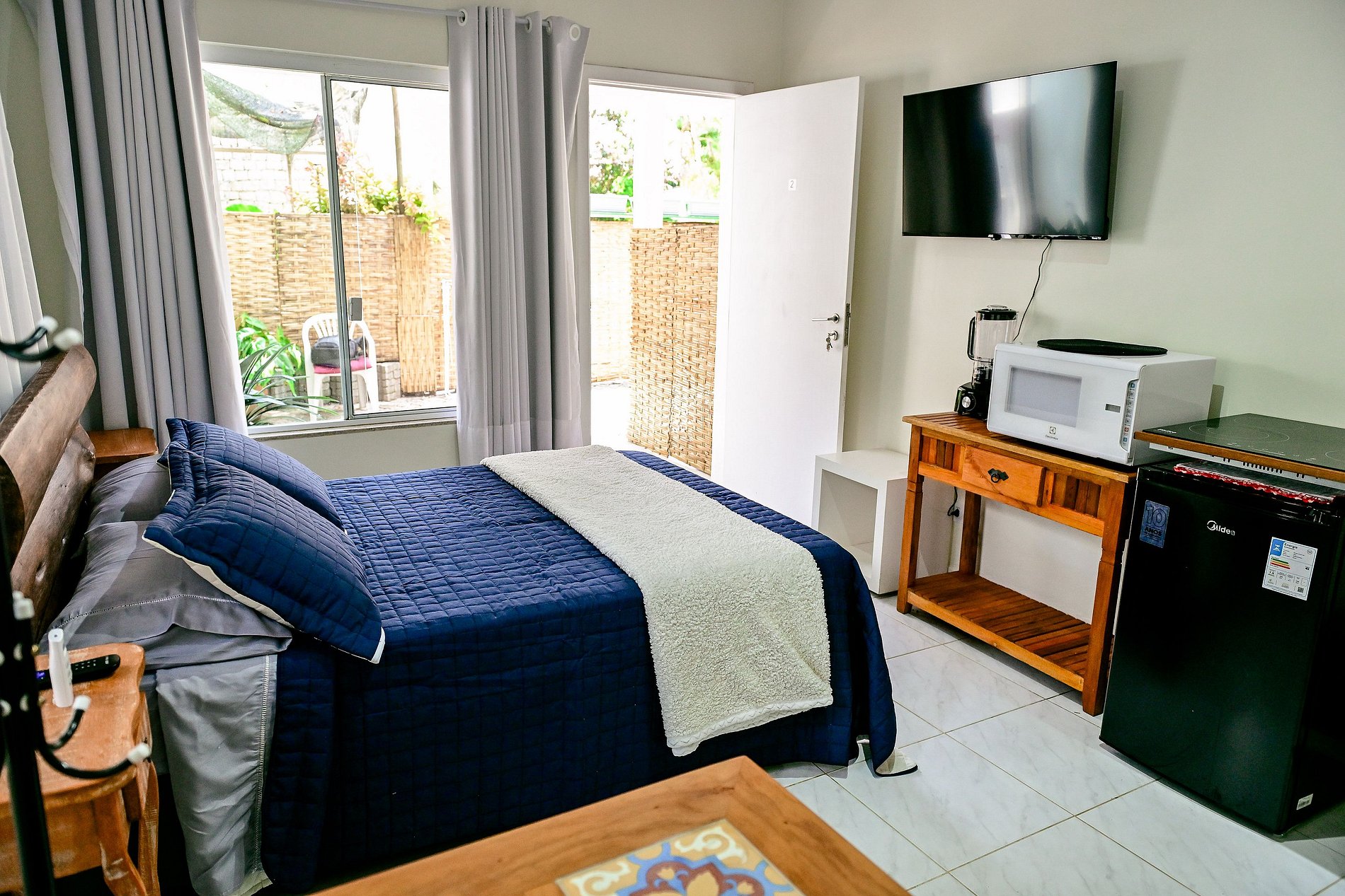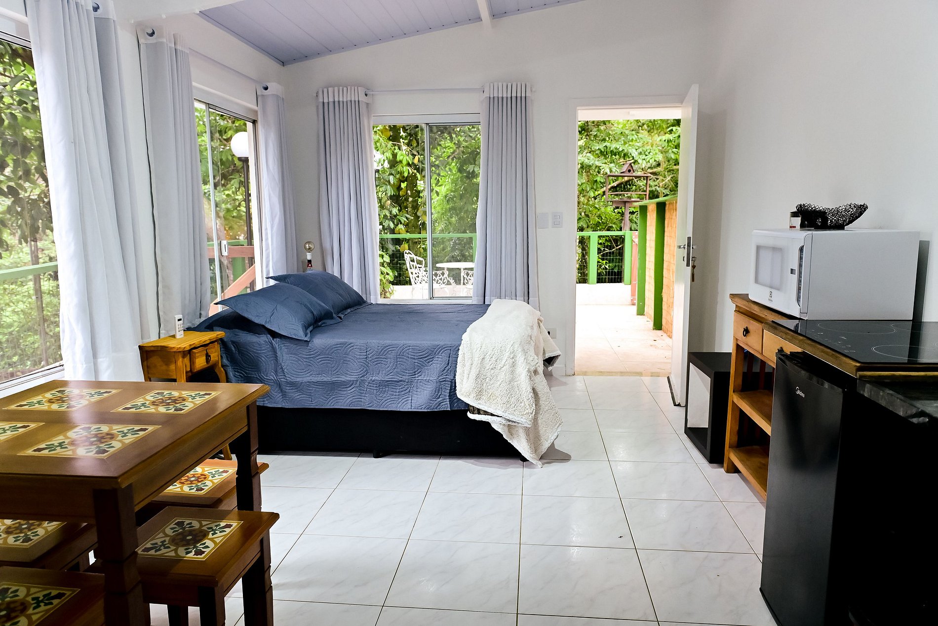 Uma suíte charmosa para duas pessoas, com ar-condicionado, TV e cozinha totalmente equipada para você se sentir em casa. A varanda fica no meio da mata, trazendo aquele clima fresco, o canto dos pássaros e a tranquilidade típica da Feiticeira. Um refúgio perfeito para descansar, aproveitar a natureza e viver dias leves com muito aconchego. E o melhor: a menos de 10 min andando da Praia da Feiticeira!