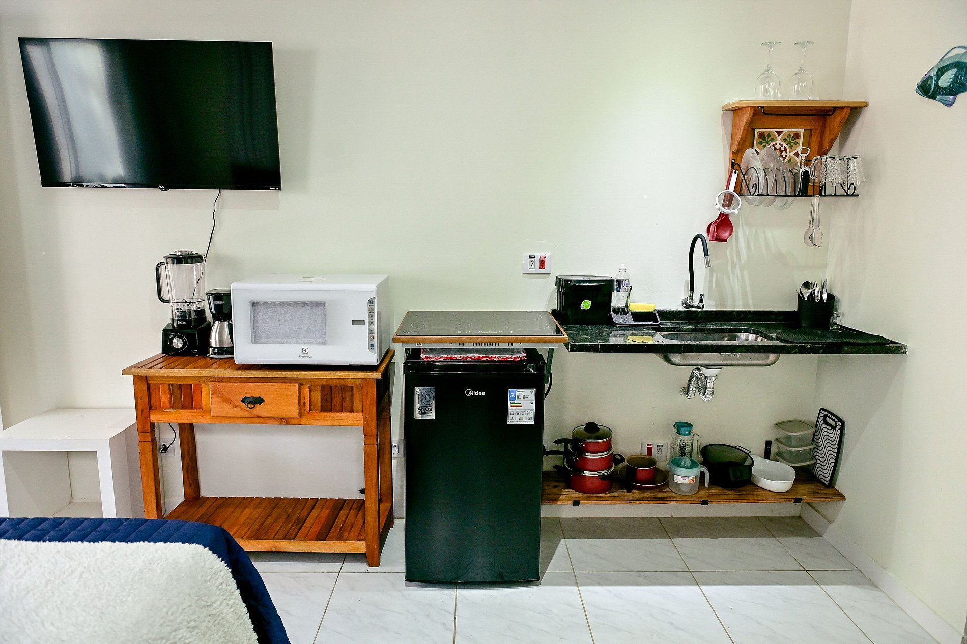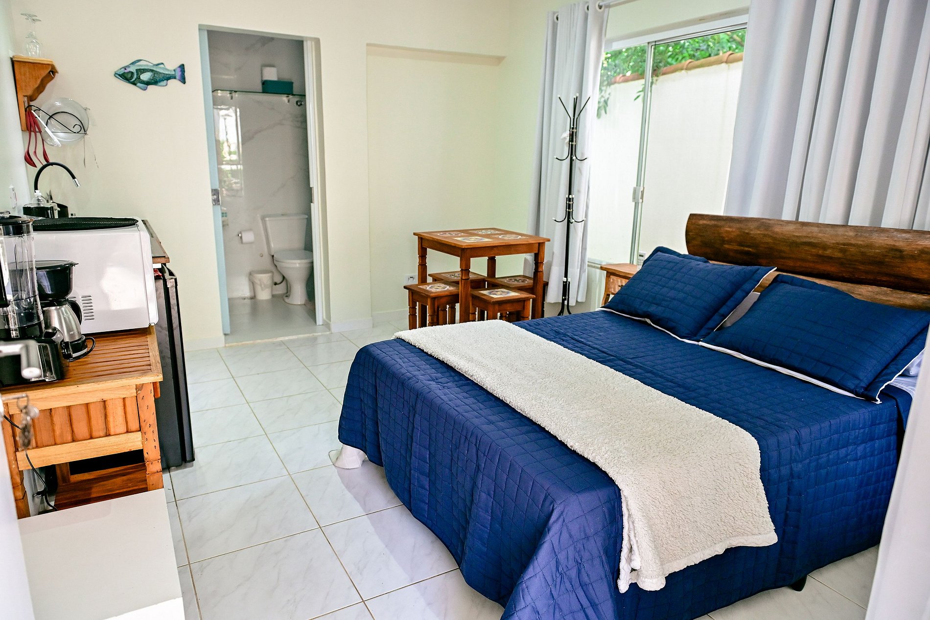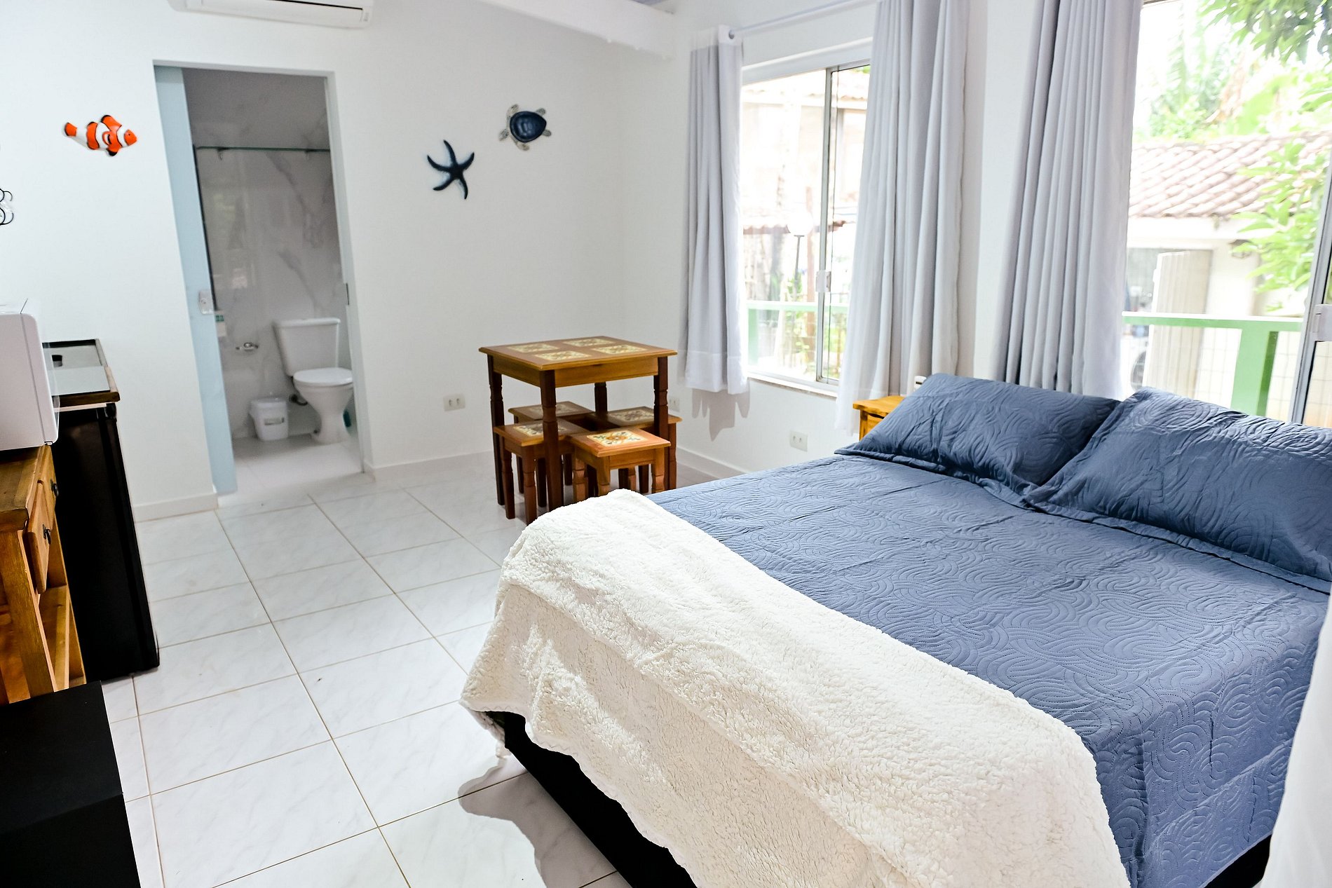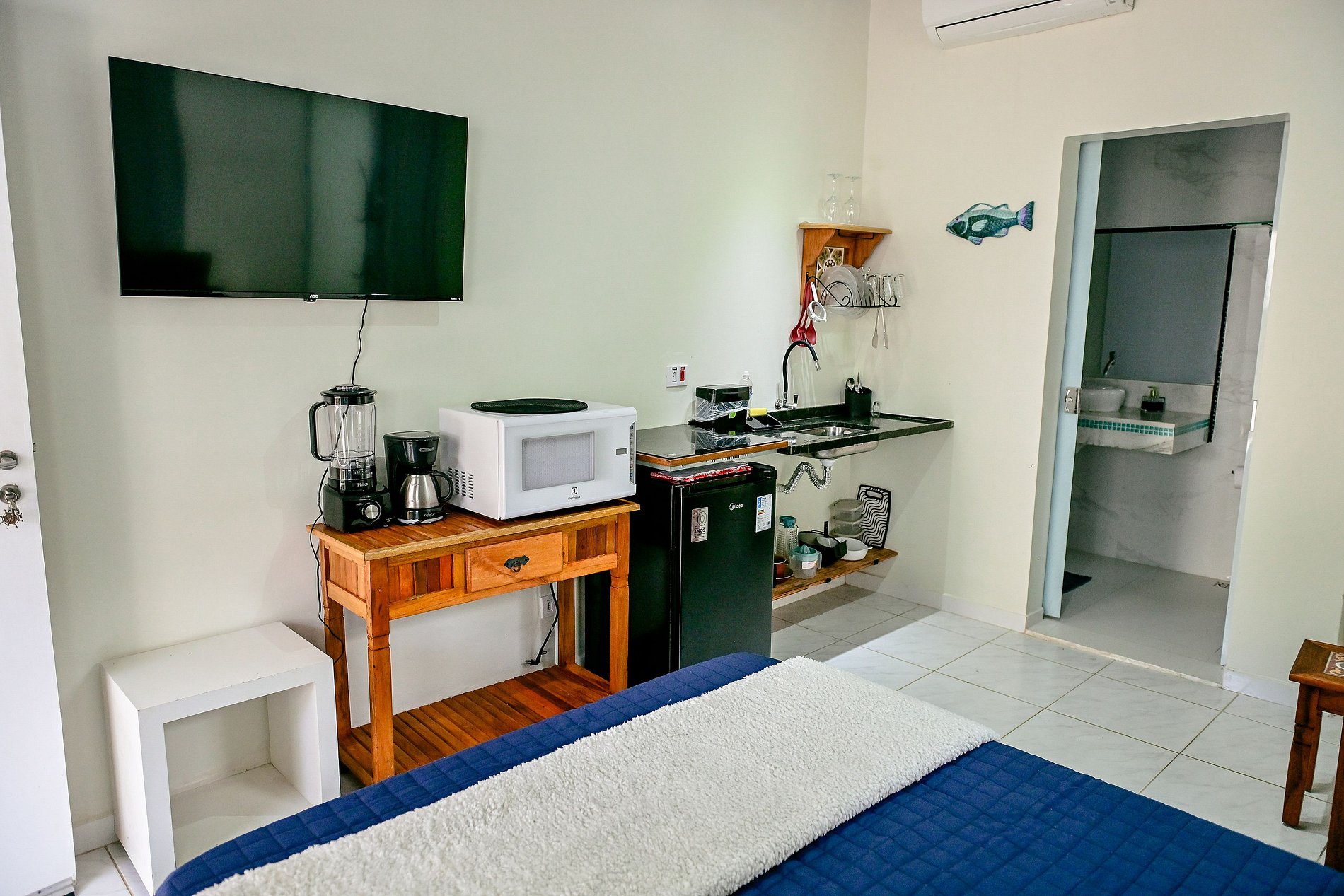 Uma suíte charmosa para duas pessoas, com ar-condicionado, TV e cozinha totalmente equipada para você se sentir em casa. A varanda fica no meio da mata, trazendo aquele clima fresco, o canto dos pássaros e a tranquilidade típica da Feiticeira. Um refúgio perfeito para descansar, aproveitar a natureza e viver dias leves com muito aconchego. E o melhor: a menos de 10 min andando da Praia da Feiticeira!