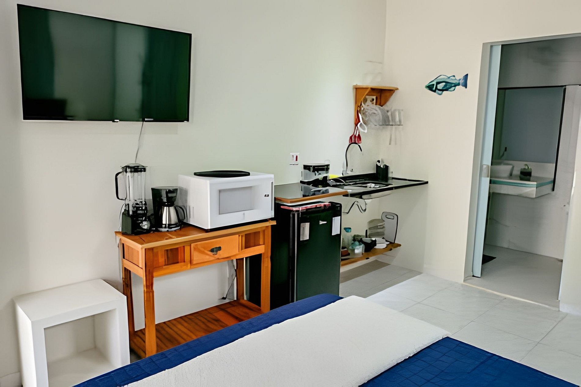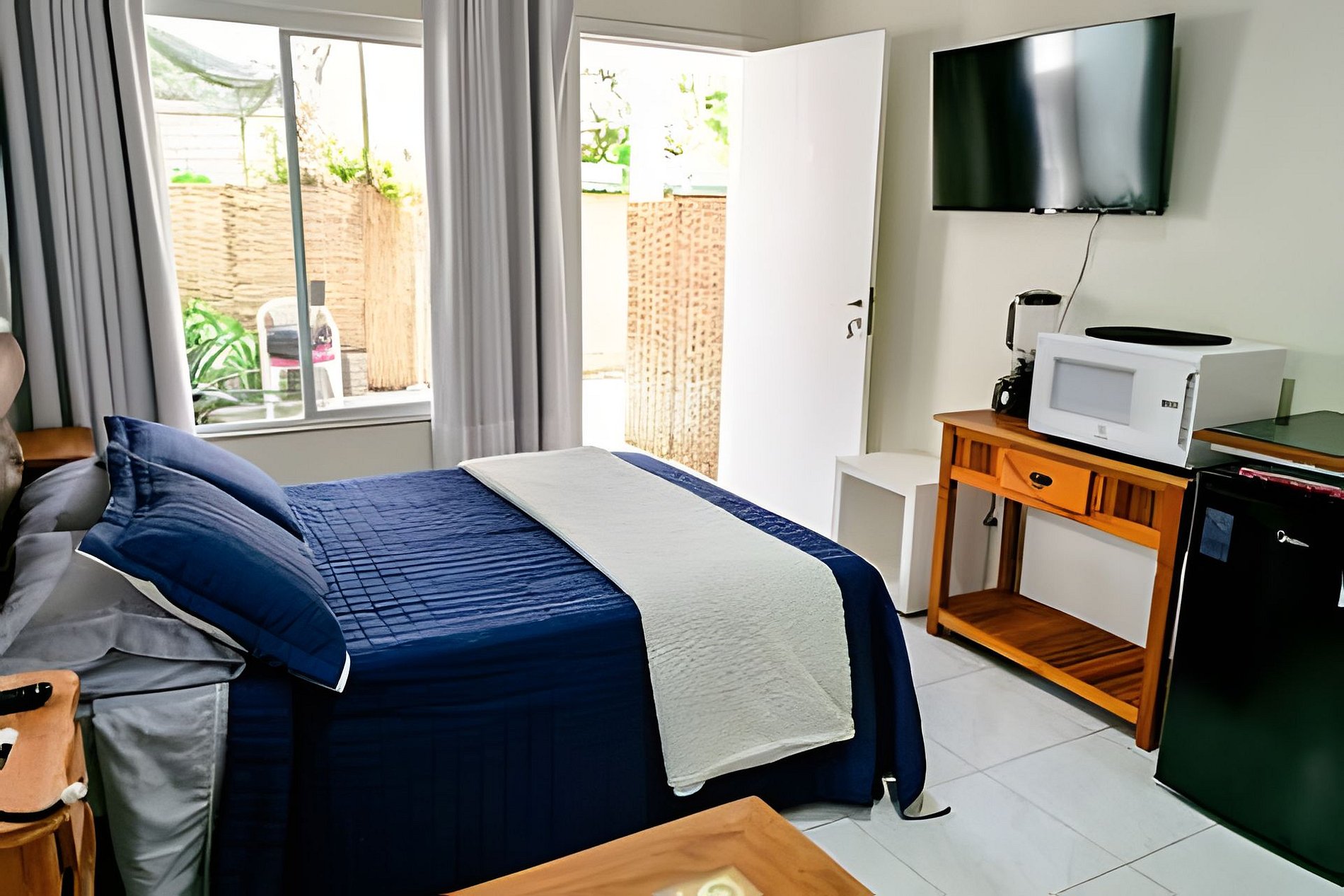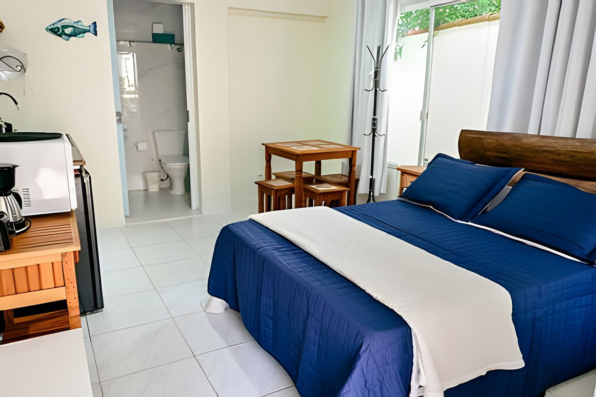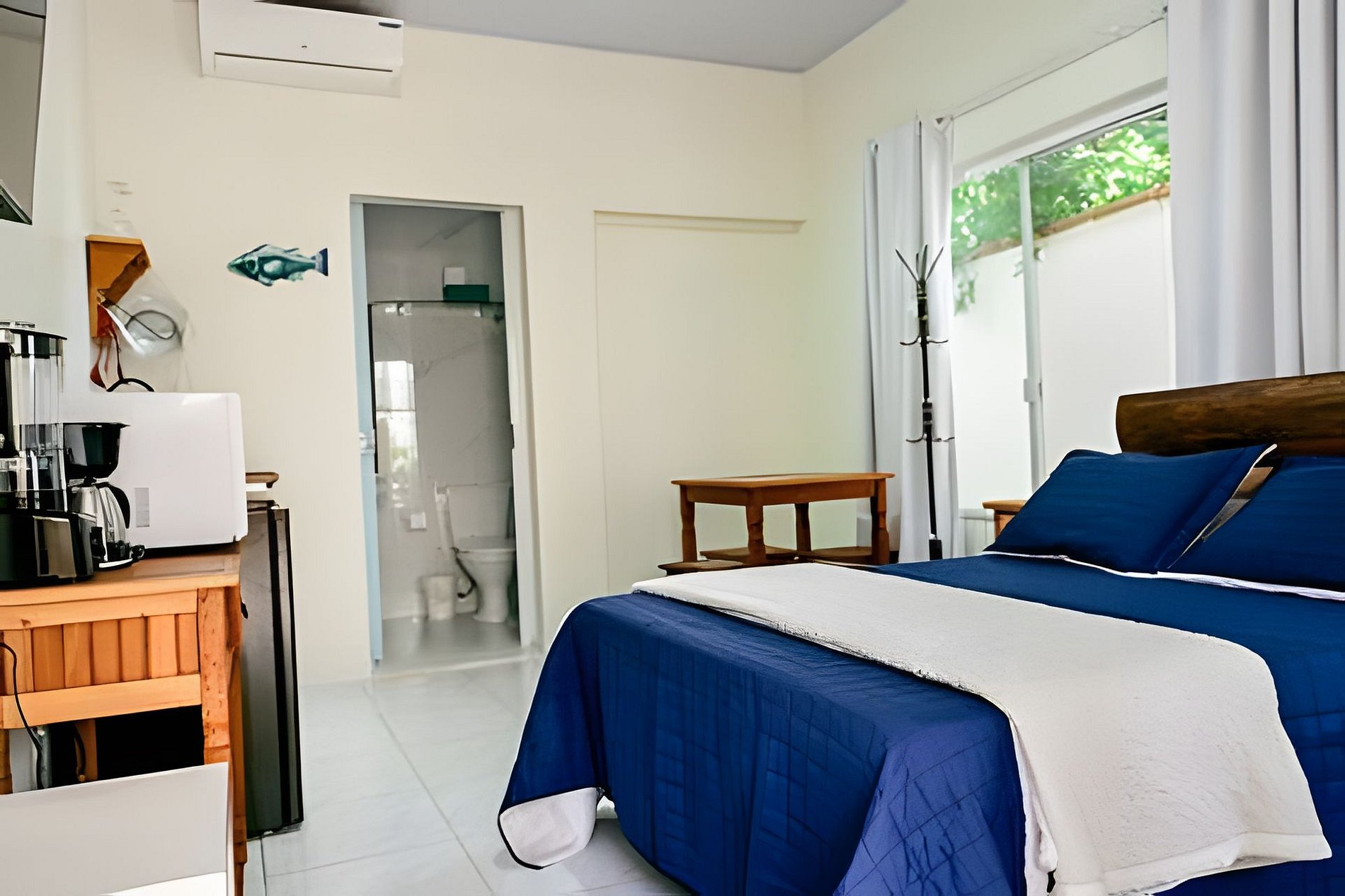 Uma suíte charmosa para duas pessoas, com ar-condicionado, TV e uma cozinha totalmente equipada para você se sentir em casa. O destaque está na varanda: imersa na mata e com vista para um riacho cristalino. Aqui, o descanso é real — você adormece com o som suave da água e acorda cercado pela natureza da Feiticeira. E o melhor: a menos de 10 min de caminhada da Praia da Feiticeira.