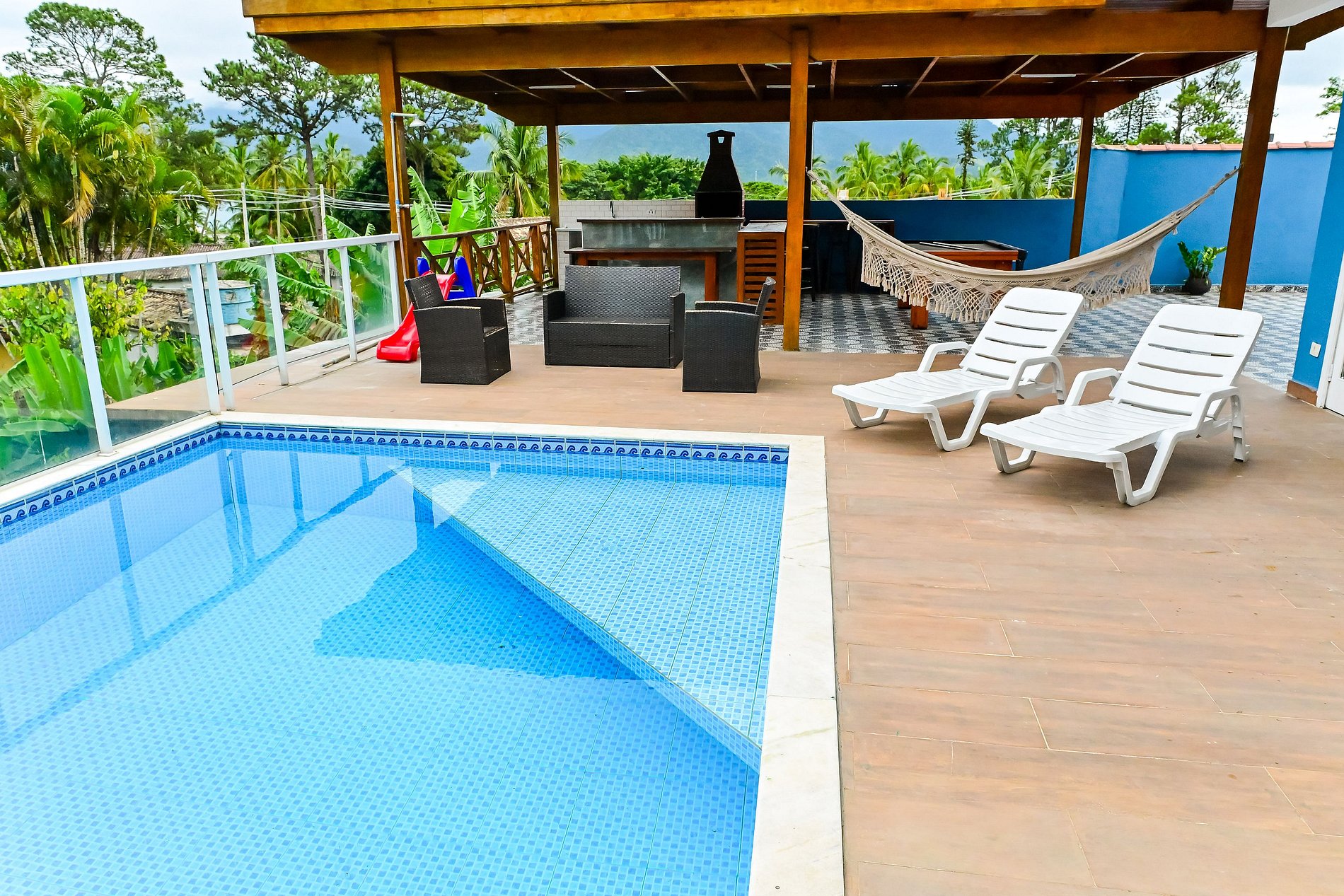 Conta também com cozinha super bem equipada e sala de estar com televisão integrada à área de lazer, garagem para 4 carros grandes e wifi de alta velocidade.