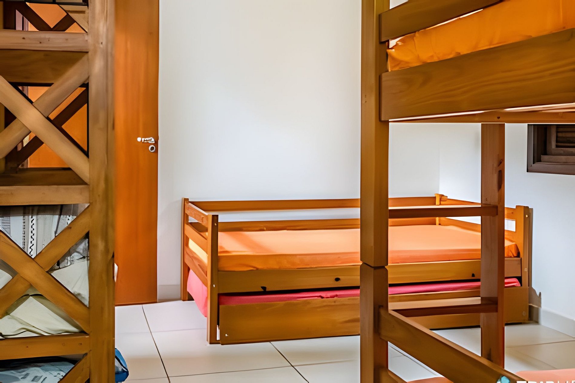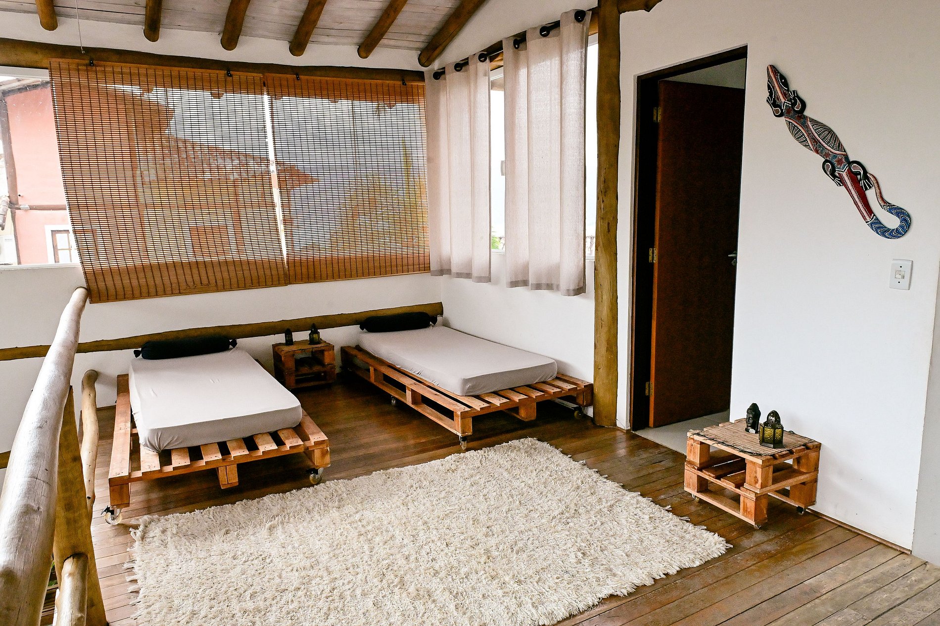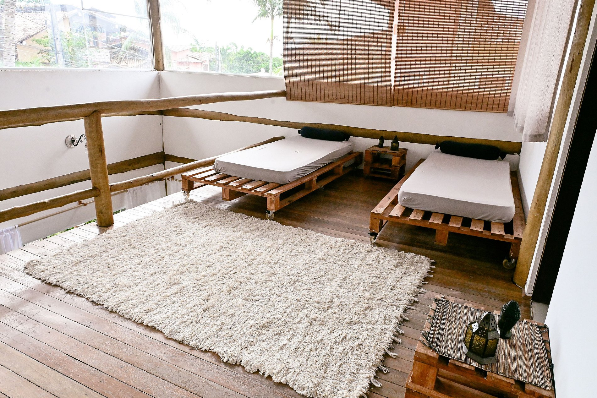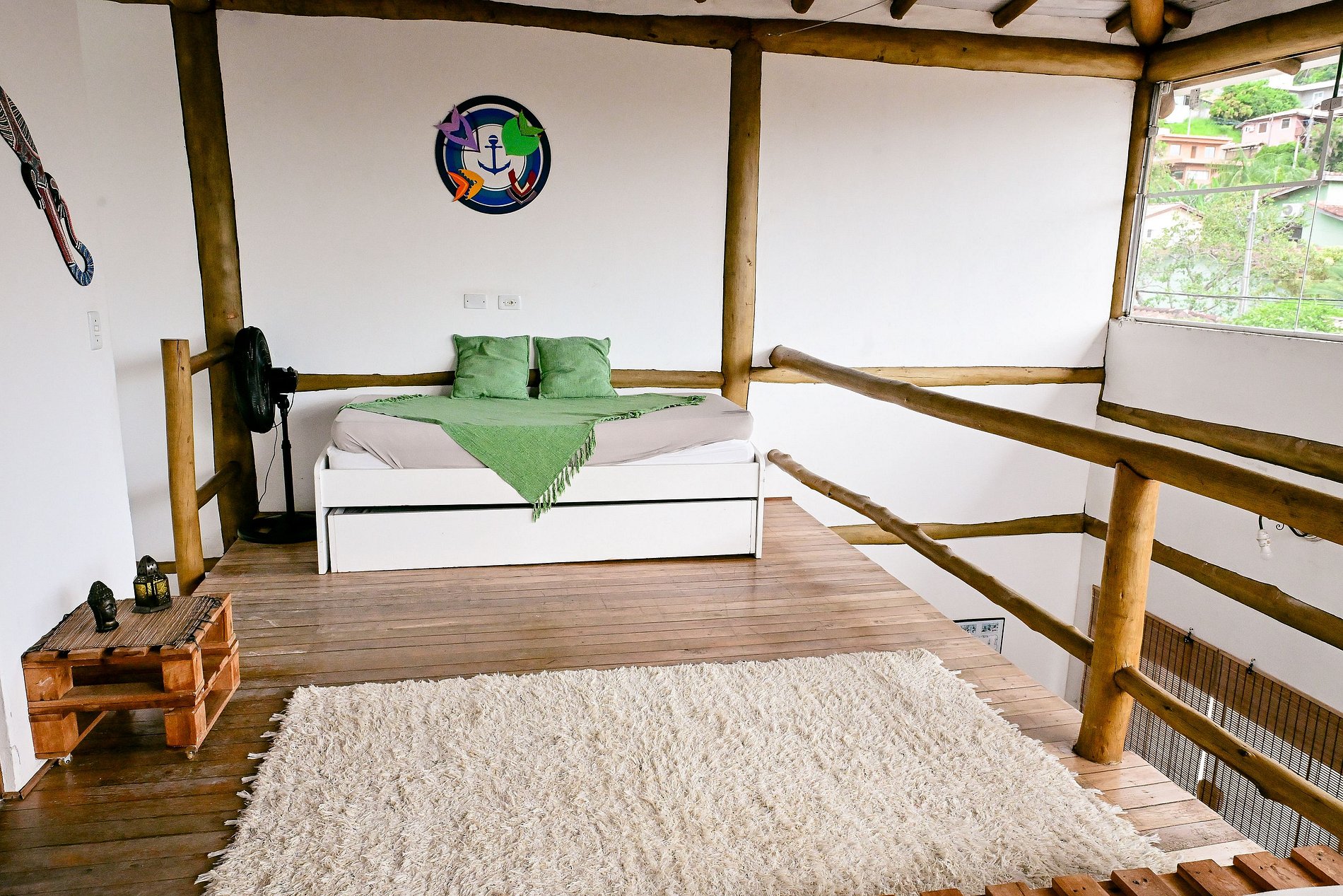 Roupas de cama e banho não estão incluídas, mas podem ser alugadas por R$60 por pessoa para toda a estadia, trazendo mais praticidade para sua viagem. O mezanino é arejado e iluminado, mas não conta com ar-condicionado nem cortinas blackout — ideal para quem gosta de acordar com a luz natural.