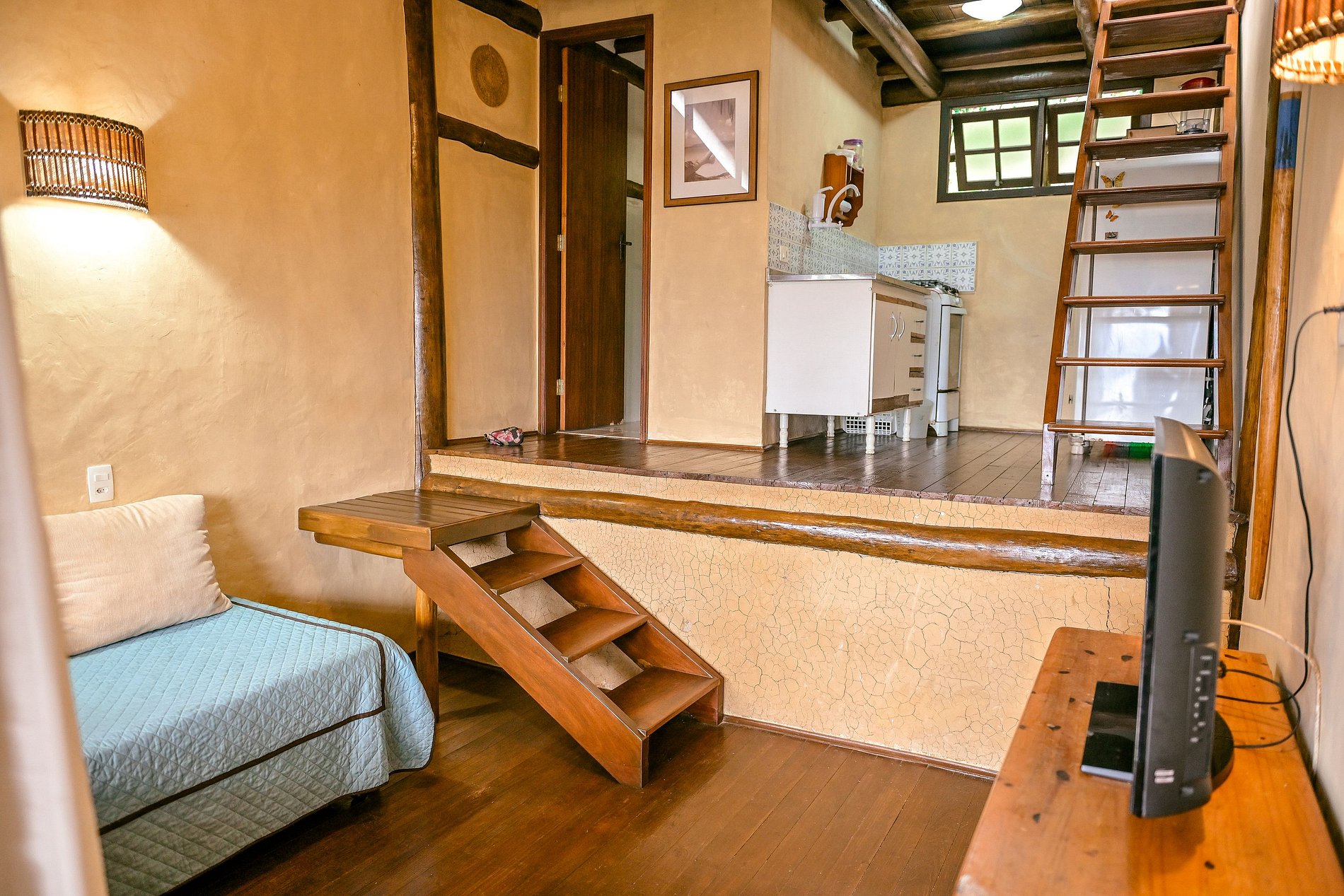No Chalé da Montanha você acorda com o som da natureza e contempla um dos melhores pores do sol da ilha. Com espaço para até 4 pessoas, o chalé oferece um ambiente acolhedor, cozinha equipada, varanda com rede e um jardim amplo, perfeito para crianças e pets. O quarto principal fica no andar superior e é acessado por uma escada íngreme, o que adiciona ao charme rústico do local. A sala conta com uma cama de solteiro e uma bicama, oferecendo conforto para todos os hóspedes.