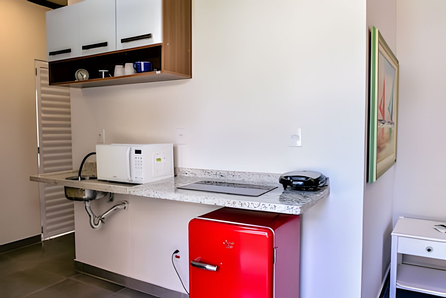 As suítes do Recanto da Feiticeira são o espaço perfeito para você curtir Ilhabela em casal e em família! Essa suíte conta com cozinha compacta, com cooktop, microondas, frigobar, pia e utensílios básicos, além de cama queen, colchão de solteiro, ar condicionado e smart TV. Outras 5 suítes sem cozinha estão disponíveis para locação conjunta.