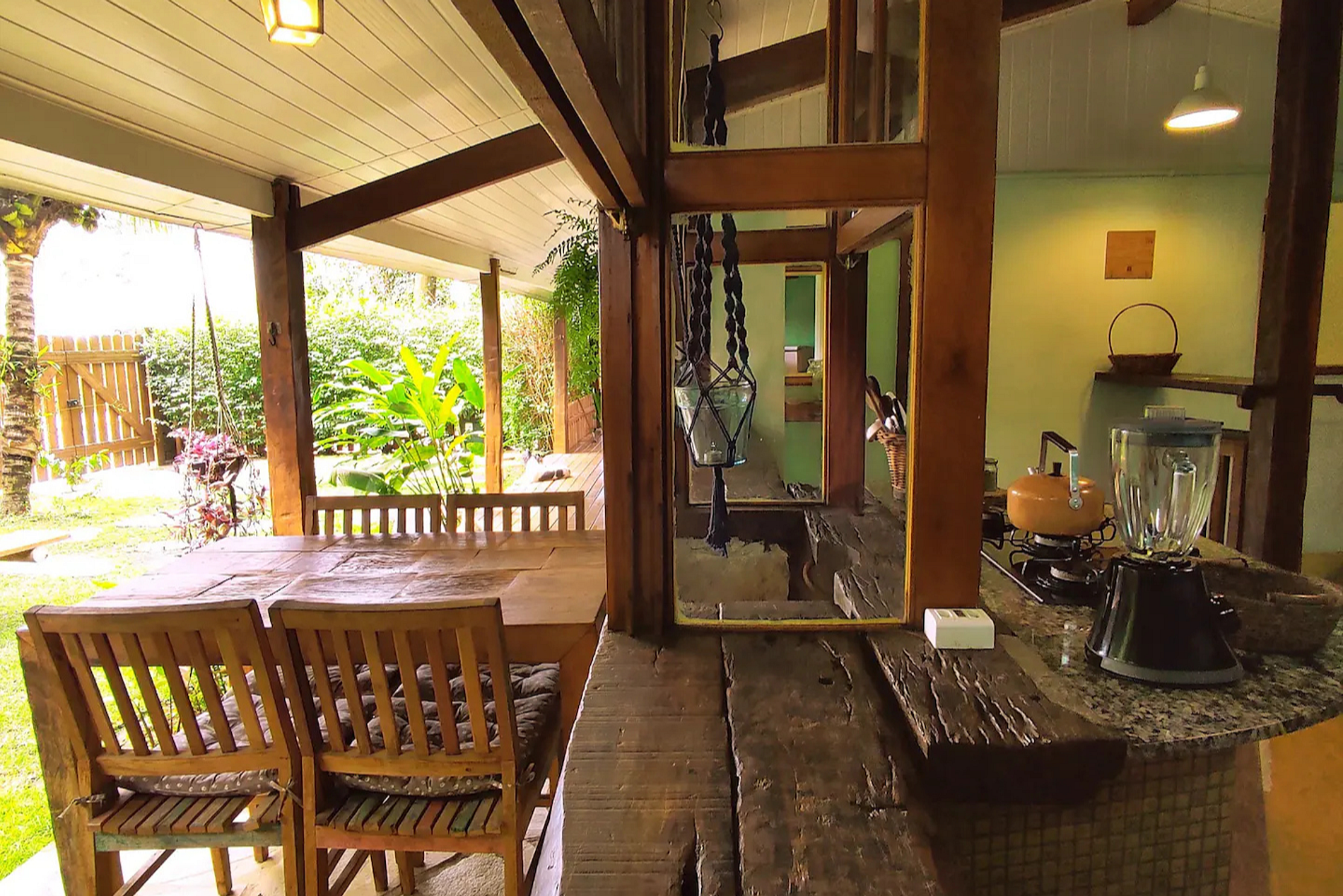 Na residência compartilhamos um delicioso jardim dos fundos e algumas plantas comestíveis, arvores de acerola, manga, coqueiro, bananeira, jerivá, além de termos uma ducha com água fresca.