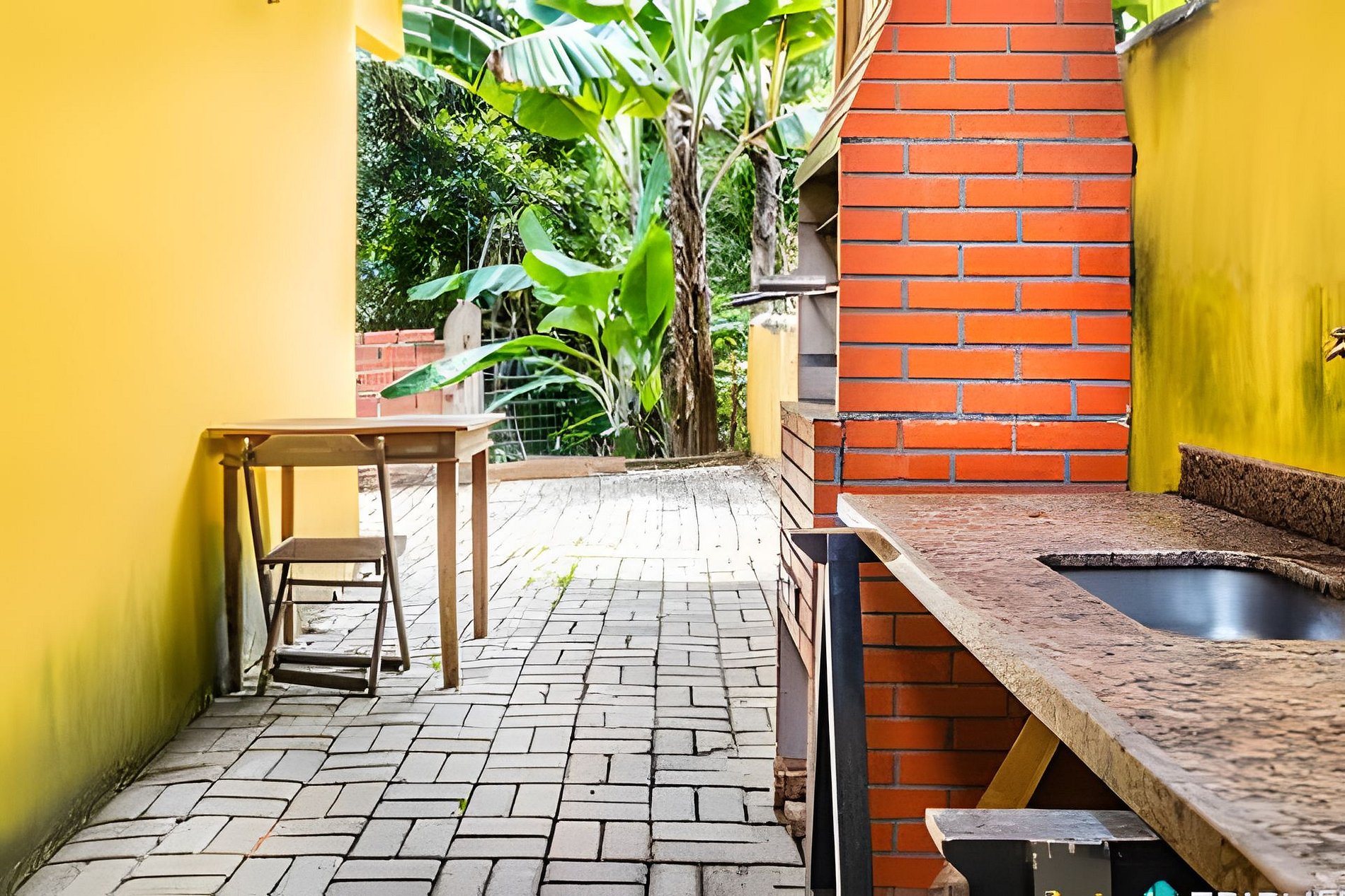 - A área externa com churrasqueira e pia é compartilhada com o chalé ao lado